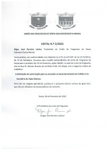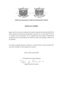 Edgar José Pereira Lézico, Presidente da União das Freguesias de Serpa (Salvador e Santa Maria), torna público, em conformidade com o…