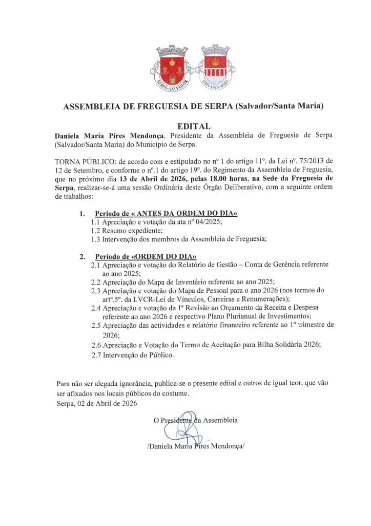 Daniela Maria Pires Mendonça, Presidente da Assembleia de Freguesia de Serpa (Salvador e Santa Maria) do Município de Serpa, torna público que no próximo dia 13 de Abril de 2026, pelas 18:00 horas realizar-se-á uma Sessão Ordinária deste Órgão deliberativo, na sede da Freguesia de Serpa, com a ordem de trabalhos publicada no edital apresentado.